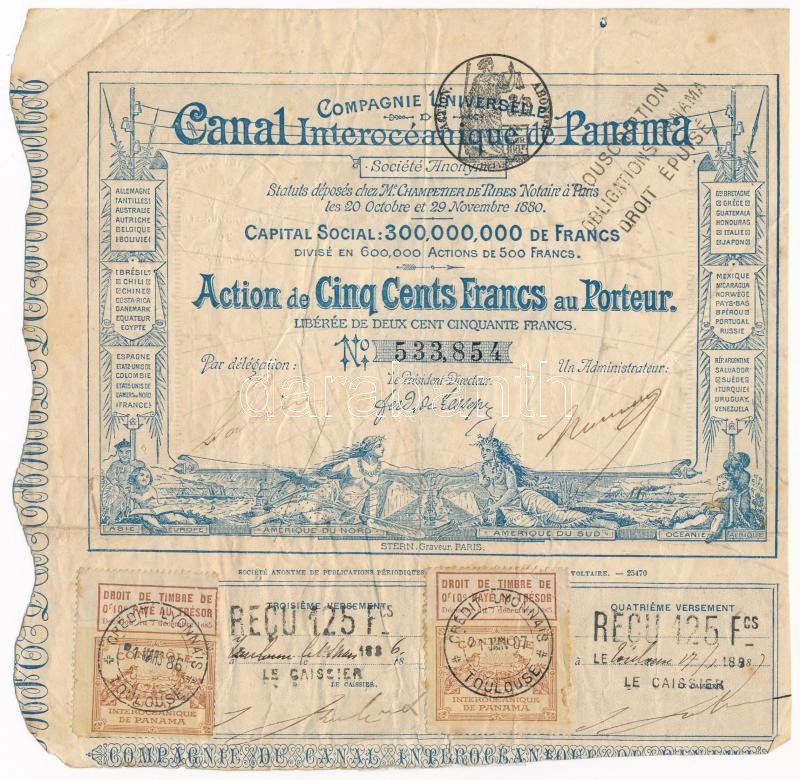 Description: Franciaország / Párizs 1880. "Compagnie Universelle Canal Interocéanique de Panama" részvénye 500Fr-ról, bélyegekkel és bélyegzésekkel T:III,III-
