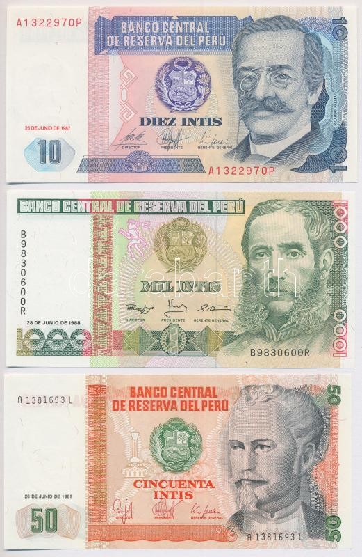Peru 1987. 10 Intis + 50 Intis + 1988. 1000 Intis C:UNC