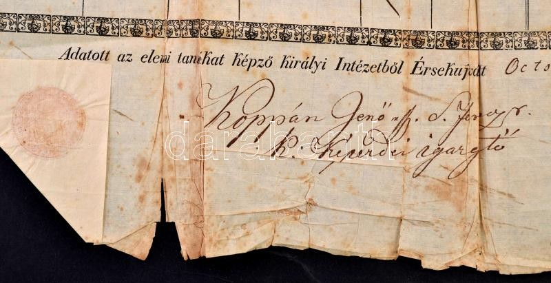 1850 Az érsekújvári tanítóképző intézet bizonyítványa, foltos, gyűrött