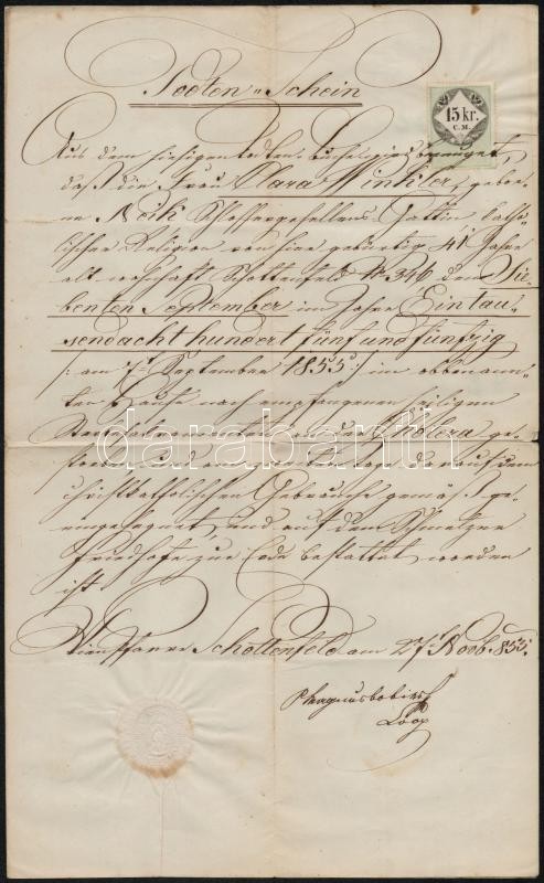https://www.darabanth.com/en/324-Online-auction/324.0/Other-collectibles/Documents~18/1855-Nemet-nyelvu-okmany-15-kr-CM-okmanybelyeggel~II1799203