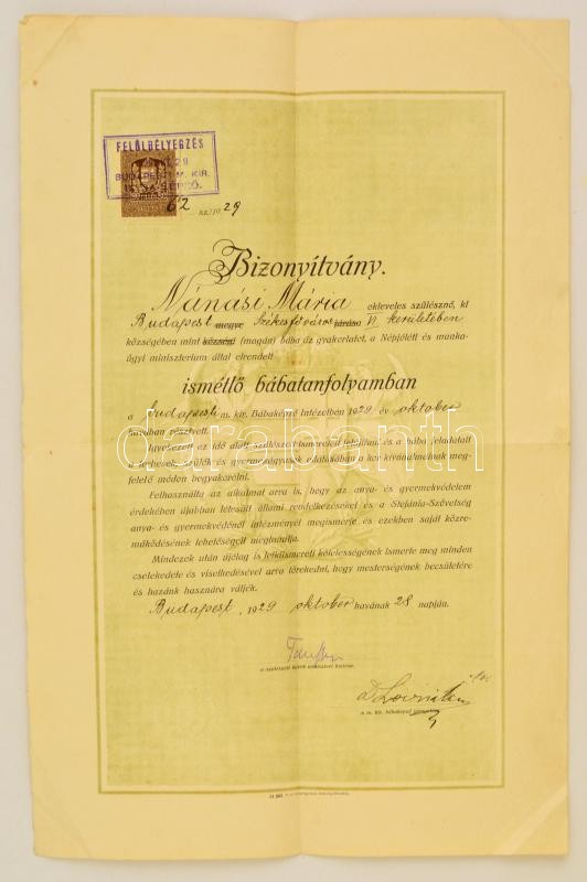 1911-1929 Budapest, a m. kir. bábaképző intézet oklevele bába részére + bizonyítvány ismétlő bábatanfolyam elvégzéséről, okmánybélyeggel