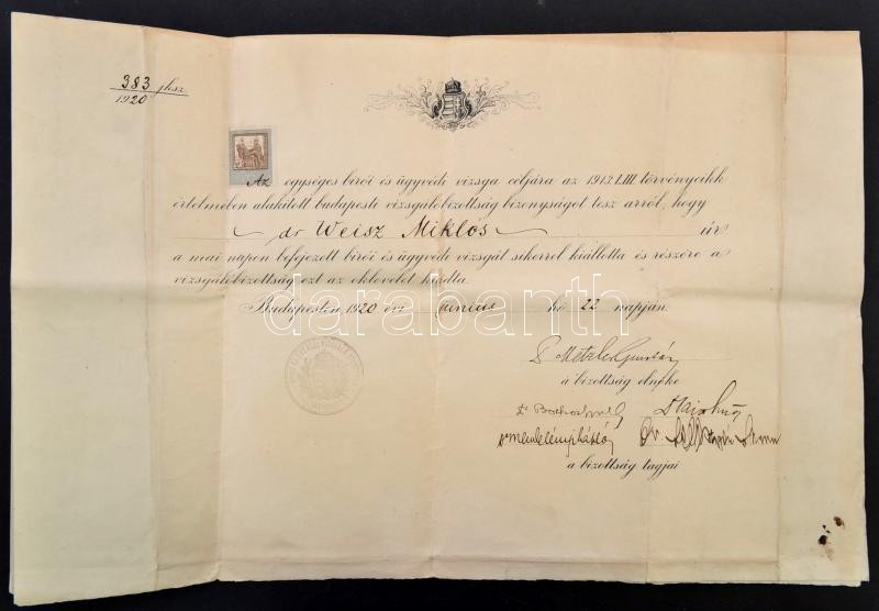 1920 Bp., bírói-ügyvédi bizonyítvány, aláírásokkal, okmánybélyeggel
