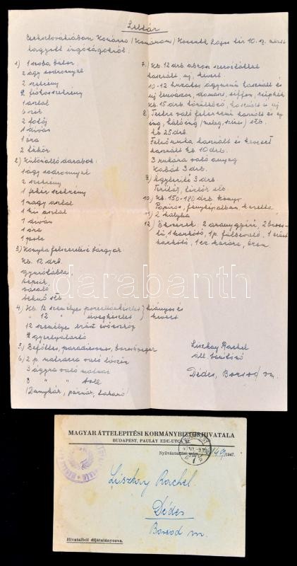 1947 A cseh-magyar lakossági áttelepítés 2 db dokumentuma, Komáromban maradt tárgyak listájával