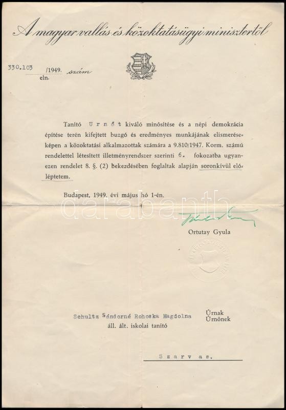 Description: 1949 Bp., soron kívüli előléptetés szarvasi általános iskolai tanítónő részére, Ortutay Gyula vallás- és közoktatásügyi miniszter aláírásával, fejléces papíron