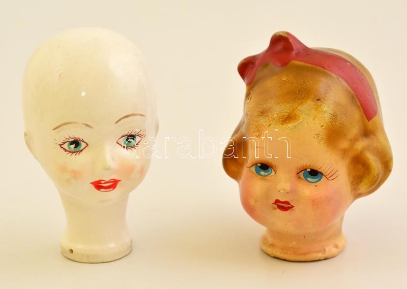 2 db régi festett babafej, egyik sérült, h: 11 és 12 cm
