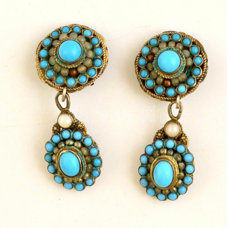 Régi fém filigrán fülbevaló gyönggyel és féldrágakővel, jelzés nélkül