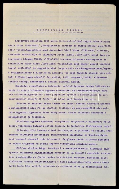 1940 Dávid Lajos (1881-1962) gépelt önéletrajza, aláírásával, okmánybélyeggel