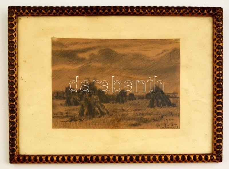 Olvashatatlan jelzéssel: Szénaboglyák, ceruza, papír, üvegezett fa ker...