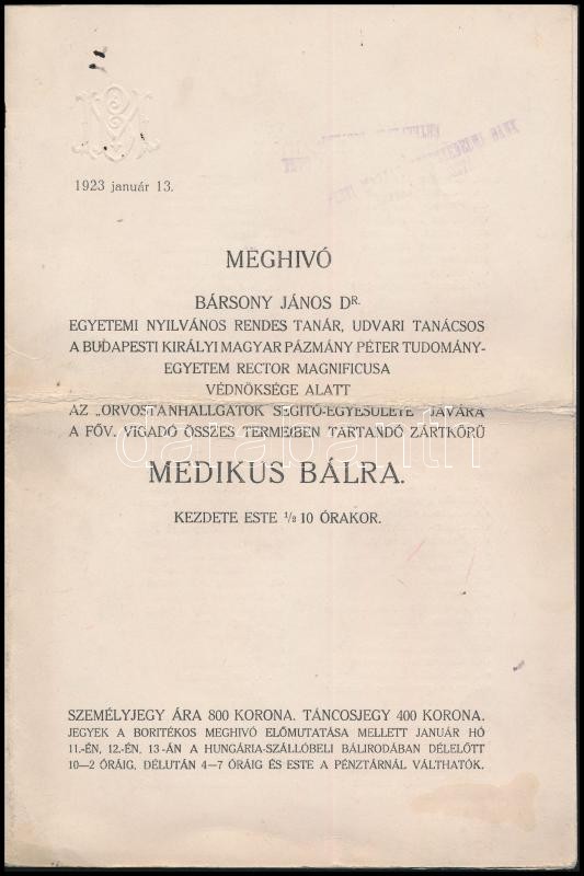 1923 Meghívó Medikus bálra, Fővárosi Vigadó, Orvostanhallgatók Segítő ...