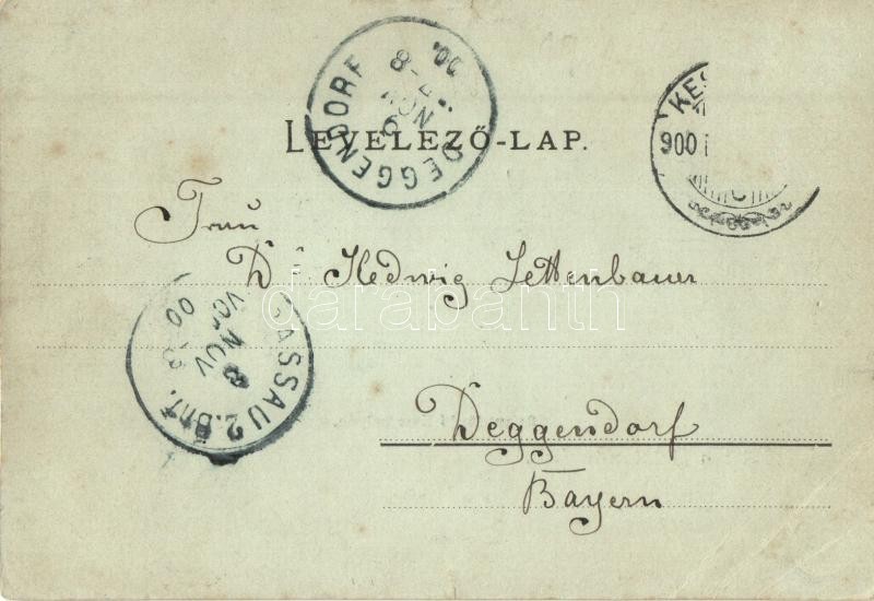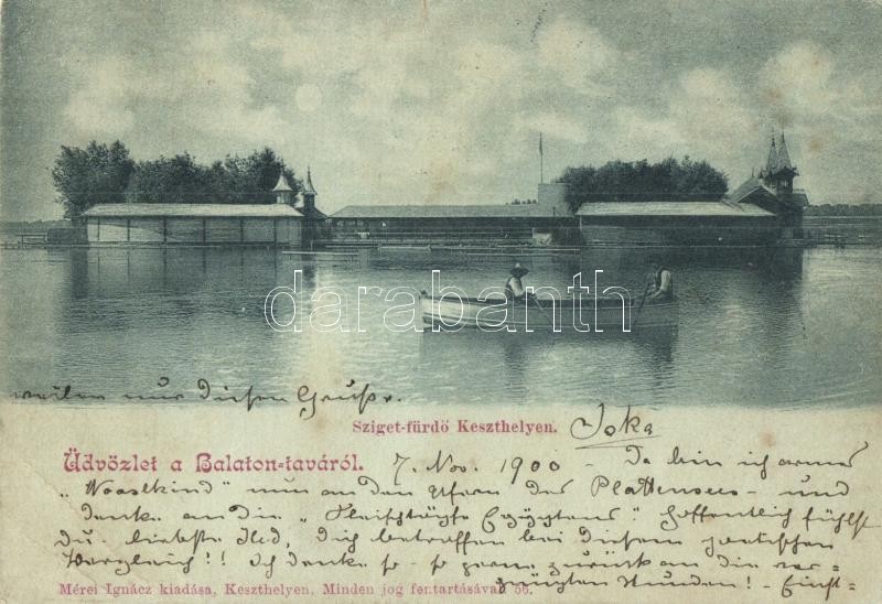 1900 Keszthely, Üdvözlet a Balaton taváról! Sziget fürdő, csónakázók. Mérei Ignác kiadása (kis szakadás / small tear)