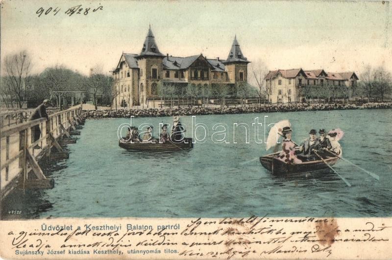 1904 Keszthely, móló, csónakázó társaságok, Hullám és Balaton szálloda. Sujánszky József kiadása (Rb)