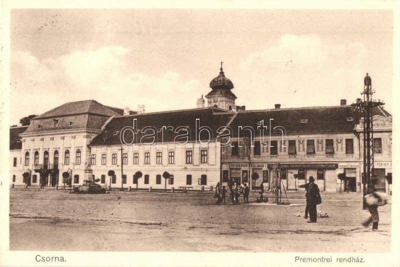 Csorna, Premontrei rendház, villanyoszlop, Cvitkovics Kálmán üzlete, Takarékpénztár, dohány és konyak üzlet