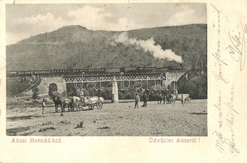 1900 Abos, Obisovice; Hernád vasúti híd, gőzmozdony, faszállító szeker...
