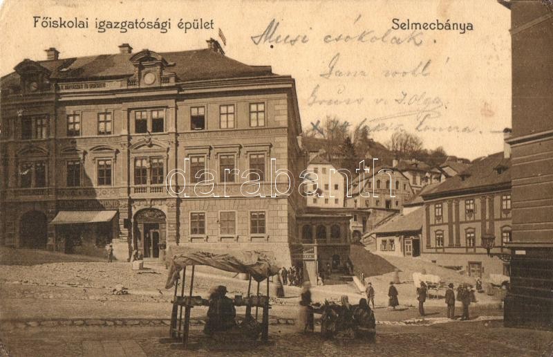1906 Selmecbánya, Schemnitz, Banska Stiavnica; Bányászati és Erdészeti főiskolai igazgatósági épület, piaci árusok, Ernst Zsigmond üzlete / mining and forestry college directorate's building, shops, market vendors (EK)