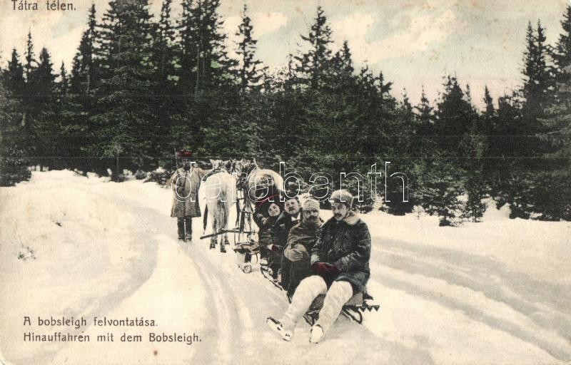 1912 Tátra, Tatry; A bobsleigh felvontatása lószánnal télen. Feitzinge... https://www.darabanth.com/en/324-Online-auction/324.0/Postcards/Slovakia~2000008/1912-Tatra-Tatry-A-bobsleigh-felvontatasa-loszannal-telen-Feitzinger-Ede-1007-Hinauffahre~II1802775
