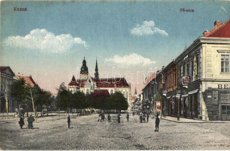 1927 Kassa, Kosice; Fő utca, üzletek, Kereskedelmi Bank váltóüzlete / ...
