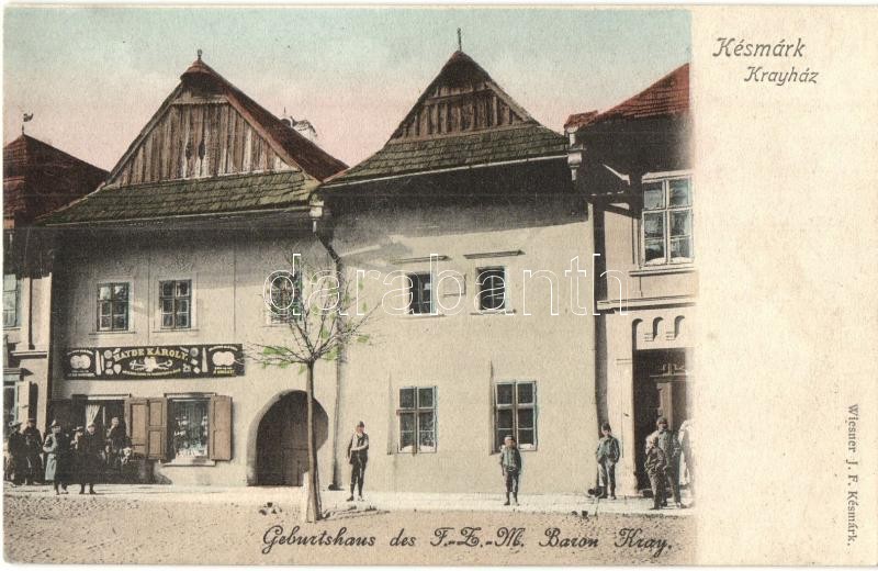 Description: Késmárk, Kezmarok; Kray ház (krajovai és topolyai báró Kray Pál szülőháza), Hayde Károly üzlete. Wiesner J. F. kiadása / Geburtshaus des Baron Kray / birthplace of Baron Paul Kray of Krajova and Topolya, shop (r)