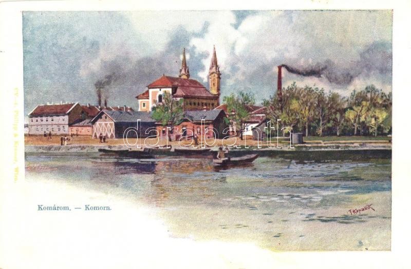 Komárom, Komárno; templom, csónakázók, gyárkémény, művészlap. Philipp ...