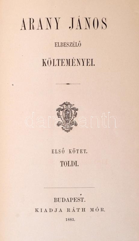 Arany János elbeszélő költeményei II. kötet. Bp., 1883, Ráth Mór. Kiadói aranyozott, festett, illusztrált egészvászon-kötés, aranyozott lapszélekkel,kissé viseltes állapotban, kissé sérült gerinccel, kissé fotlos borítóval, a hátsó szennylapot és az előzéklapot összeragasztották.