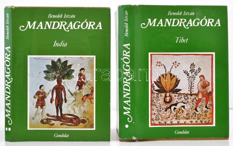 Benedek István: Mandragóra. I-II. kötet. I.kötet: Tibet. II. kötet: India. Kultúrtörténeti tanulmány különös tekintettel a varázslásra és gyógyÃtásra. Bp.,1979, Gondolat. Kiadói egészvászon-kötés, kiadói papÃr védÅ‘borÃtóban.