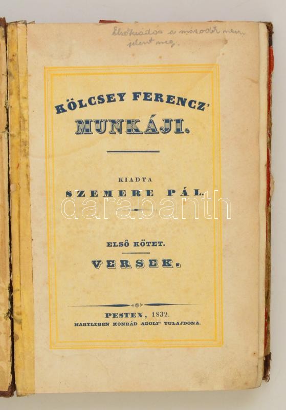 https://www.darabanth.com/en/325-Online-auction/325.0/Books/Books-Other-rarities~1000018/Kolcsey-Ferencz-munkaji-Kiad-Szemere-Pal-1-kot-Versek-Pest-1832-Hartleben-Konrad-Adol~II1806197