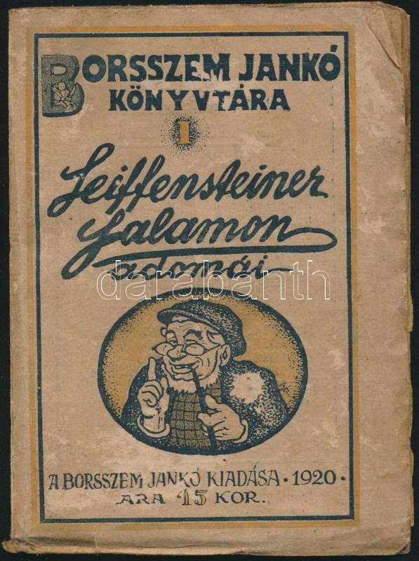 [Molnár Jenő]: Seiffensteiner Salamon adomái. Bér Dezső és Zórád Antal szövegközti rajzaival. Borsszem Jankó könyvtára 1. sz. Bp.,1920, Borsszem Jankó. Kiadói illusztrált papírkötés, foltos borítóval, kis sérüléssel a gerincen.