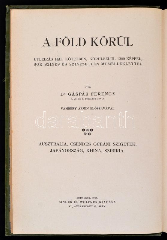 Dr. Gáspár Ferencz: A Föld körül. V. kötet. Ausztrália, Csendes óceáni szigetek, Japánország, Khina, Szibiria. Bp.,1908, Singer és Wolfner. Kiadói aranyozott, festett, illusztrált, dombornyomásos zöld egészvászon-kötés, Wolfner-kötés, kissé kopott borítóval, gerinccel, kissé sérült gerinccel.