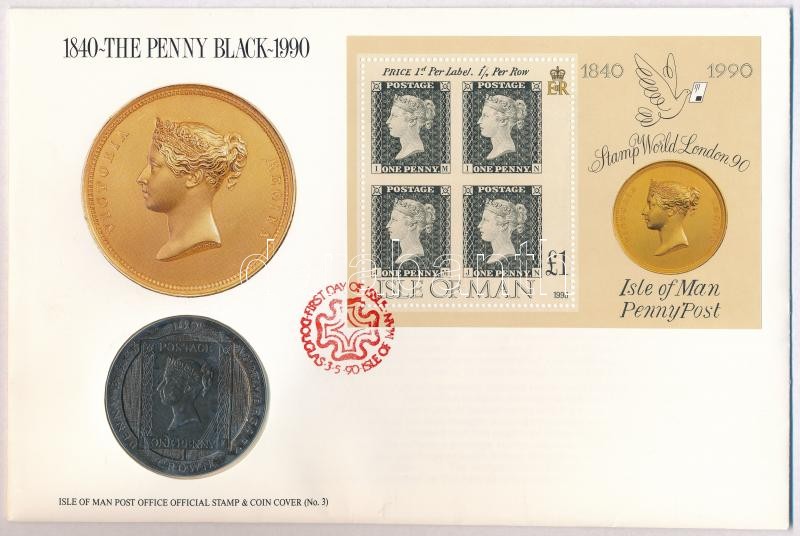 Description: Man-sziget 1990. 1C "Penny Black" érmés borítékon elsőnapi bélyegzős bélyegblokkal, ismertetővel T:1