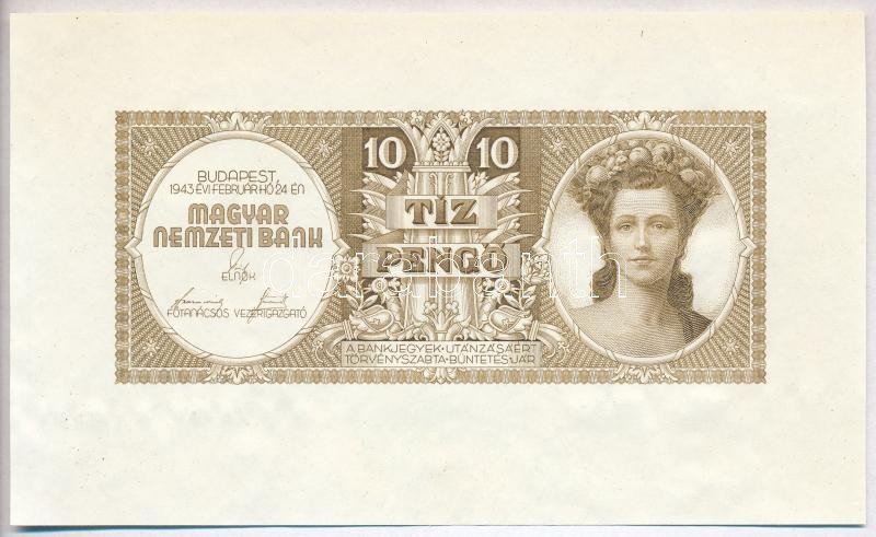 1943. 10P tervezet próbanyomata, utánnyomás, csak előlap T:I-