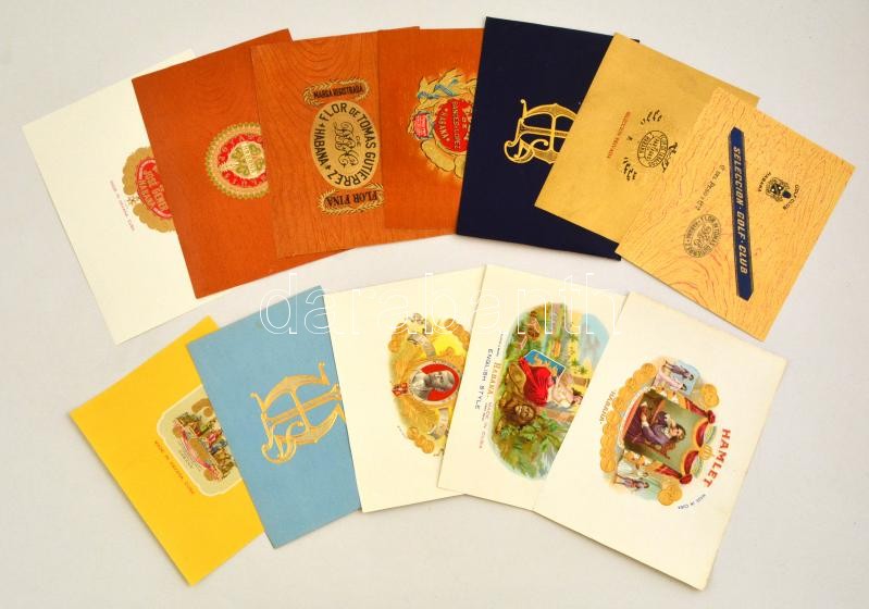 12 db szivardoboz címke, közte litho és sok dombonyomott, aranyozott, 14x21 cm és 19x26 cm közötti méretben / 12 pc. cigar box labels