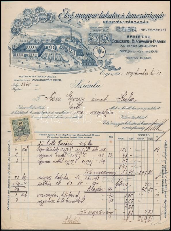 1911 Eger, Első magyar lakatos és lemezárugyár díszes fejléces száma, ...