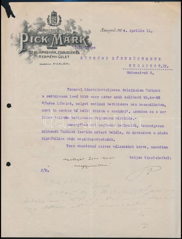 1924 Pick Márk szalámigyár, zsiradék és termény üzlet díszes fejléces...