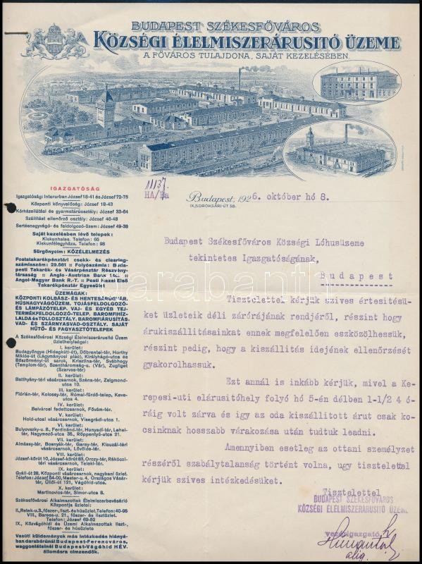 1926 Budapest Székesfőváros Községi Élelmiszerárusító Üzeme díszes fejléces levél, 30x23 cm