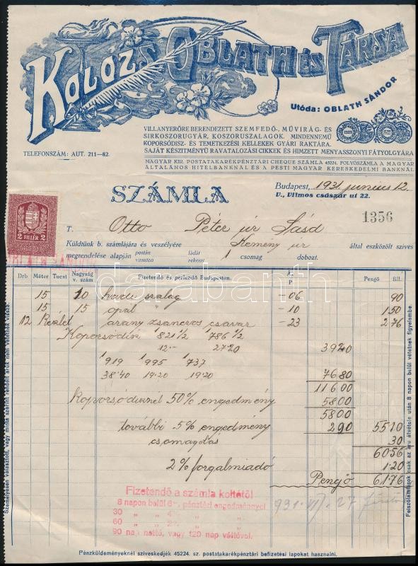 1931 Kolozs Oblath és Társa temetkezési kellékek gyára díszes fejléces számla, okmánybélyeggel