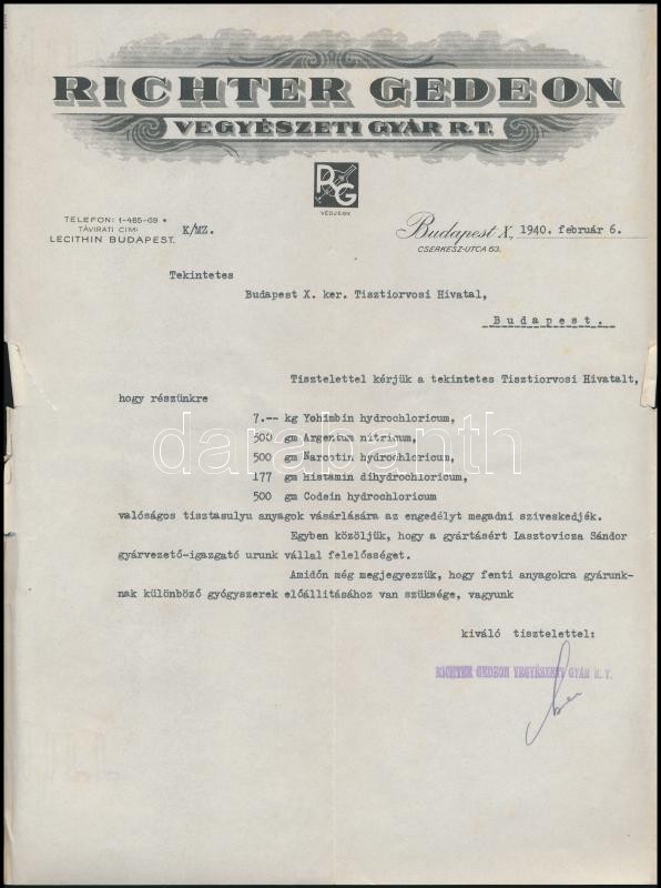 1940 Richter Gedeon Vegyészeti Gyár díszes fejléces levél, szélén szak...