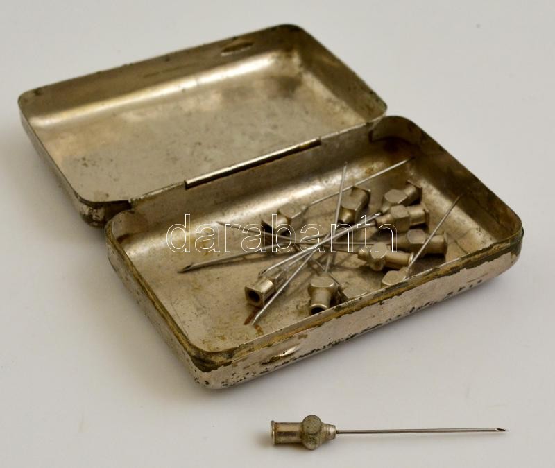 11 db régi orvosi tű, fém tárcában, 8,5×6,5 cm