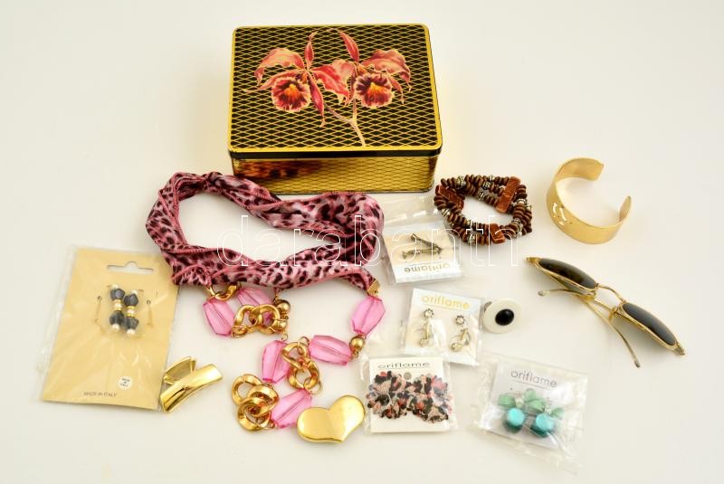 Bizsu és bolha tárgyak fém dobozban, összesen: 13 db