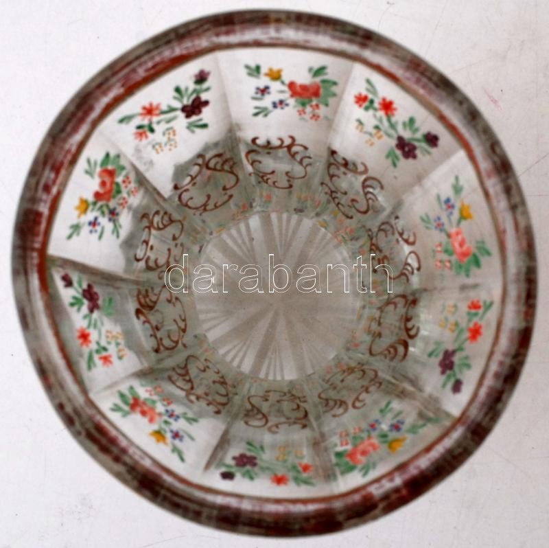 cca 1860 Emlékpohár, formába fúvott üveg, csiszolt, zománc festett, kopott aranyozott peremmel, m:13cm /circa 1860 Memorial Cup, mold blown glass, polished, painted enamel, gold rim, m: 13cm