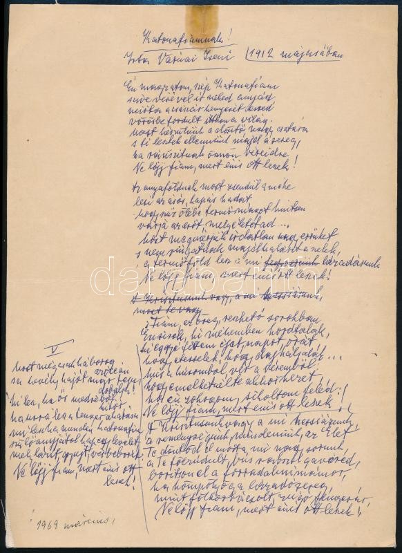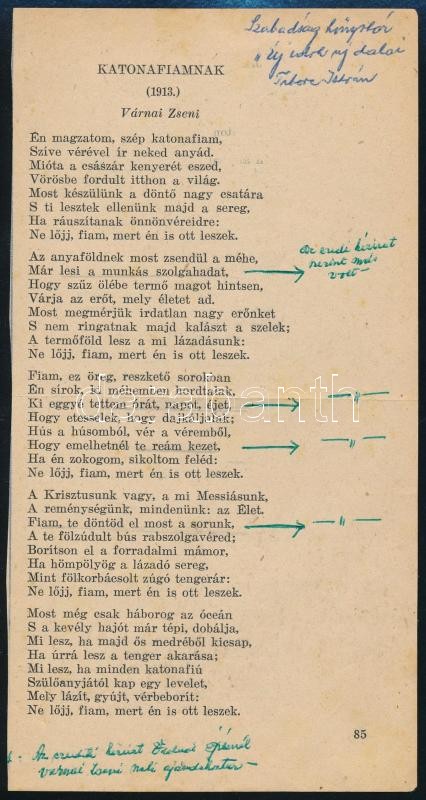 1969 Várnai Zseni (1890-1981) költőnő "Katonafiamnak" című v... https://www.darabanth.com/en/325-Online-auction/325.0/Other-collectibles/Historical-documents-manuscripts~18/1969-Varnai-Zseni-1890-1981-koltono-Katonafiamnak-cimu-versenek-kesobbi-kezirata-mel~II1806229