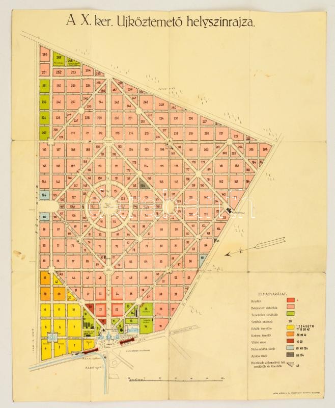 cca 1930 A X. kerület Új köztemető helyszínrajza, hajtott, kis szakadásokkal, 46×40 cm