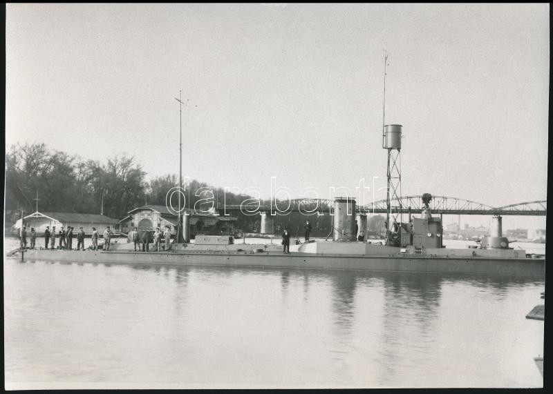 Description: 1915 A Wels őrnaszád vízre bocsátása után az újpesti öbölben, a géppuskatornya még hiányzik, az 1980-as években eredeti negatívról előhívott másolat, hátoldalon feliratozva, 16,5×23 cm