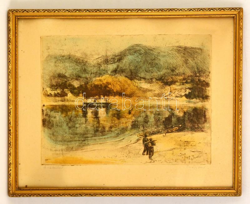 Elekfy Jenő (1895-1968): Ősz a Kis-Dunánál, színezett rézkarc, papír, ...