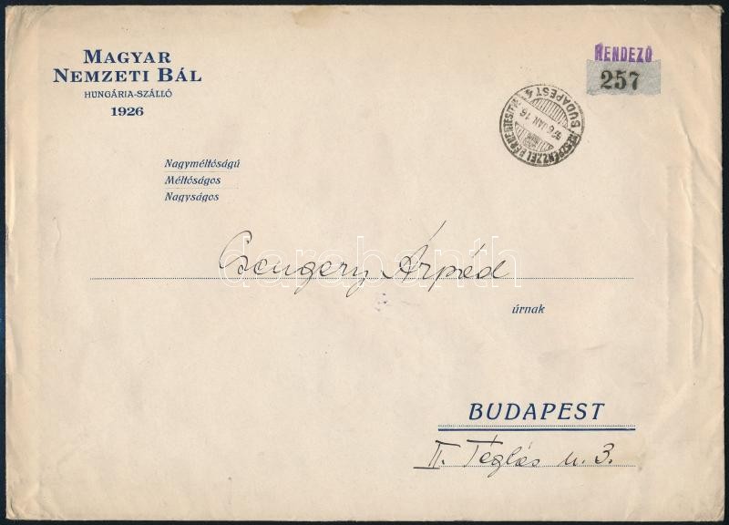 1926 Bp., Meghívó a Magyar Nemzeti Bálra, borítékkal
