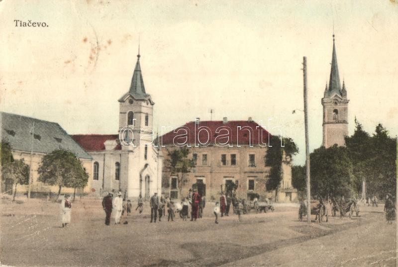 Description: Técső, Tiacevo, Tiachiv; Fő tér, Református templom, Római katolikus templom. Szabó Leopold kiadása / main square, Calvinist church, Roman Catholic church (EK)