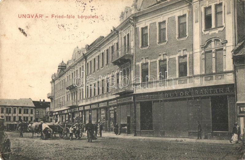 Ungvár, Uzshorod, Uzhhorod, Uzhorod; Fried-féle bérpalota, Hirsch és Stark bútor raktára, Groszman Náthánné, Moskovits, Spiegel üzlete. Steinfeld Dezső kiadása / Fried tenement house, furniture store, shops (EK)