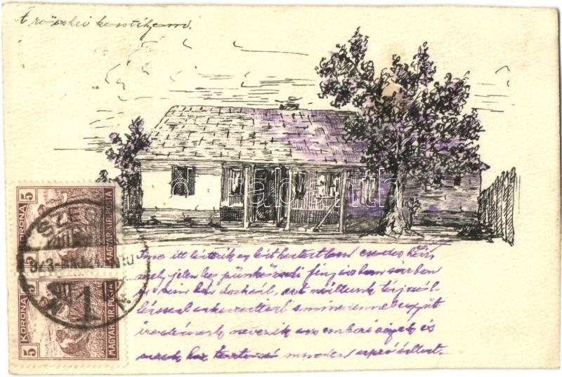Description: 1923 Röszke, Szilágyi Sándor m. kir. III/212. őrs írnok hadnagy saját kezű rajza a kastélyáról. Egyedi képeslap / custom made hand-drawn TCV postcard (EK)
