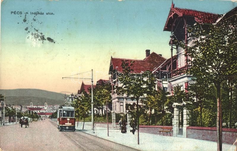 Pécs, Indóház utca, villa, villamos (EK)