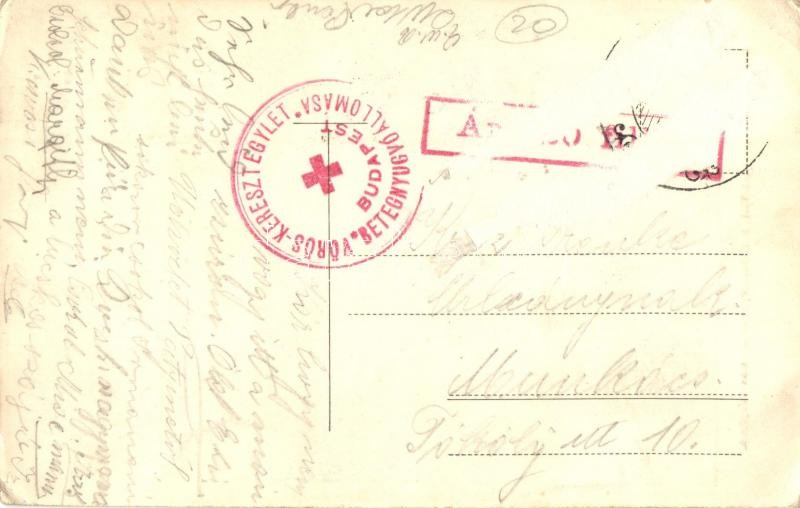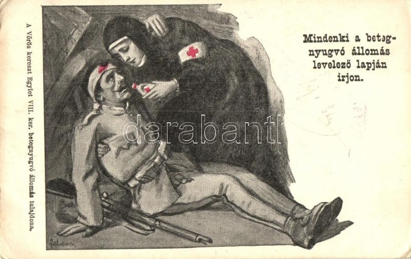 Description: Mindenki a betegnyugvó állomás levelezőlapján írjon. A Vörös Kereszt Egylet VIII. kerületi betegnyugvó állomásának tulajdona / WWI Hungarian Red Cross propaganda s: Földes + So. Stpl. (Rb)