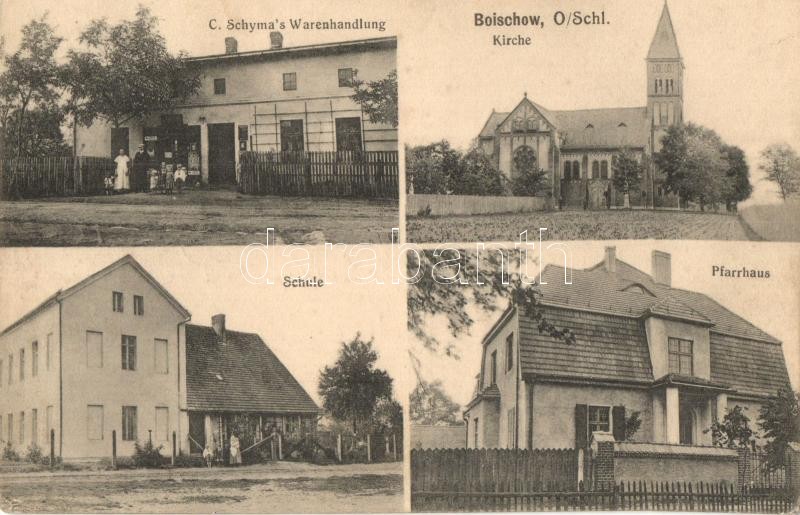 1914 Bojszowy, Boischow; Kirche, Schule, Pfarrhaus, C. Schyma's Warenhandlung / church, school, rectory, shop + Bezenye P.Ü.