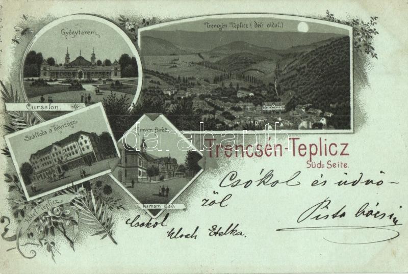 1898 Trencsénteplic, Trencianske Teplice; Gyógyterem, Szálloda a Hővízhez, Hamam fürdő / spa, hotel. Art Nouveau, floral, litho
